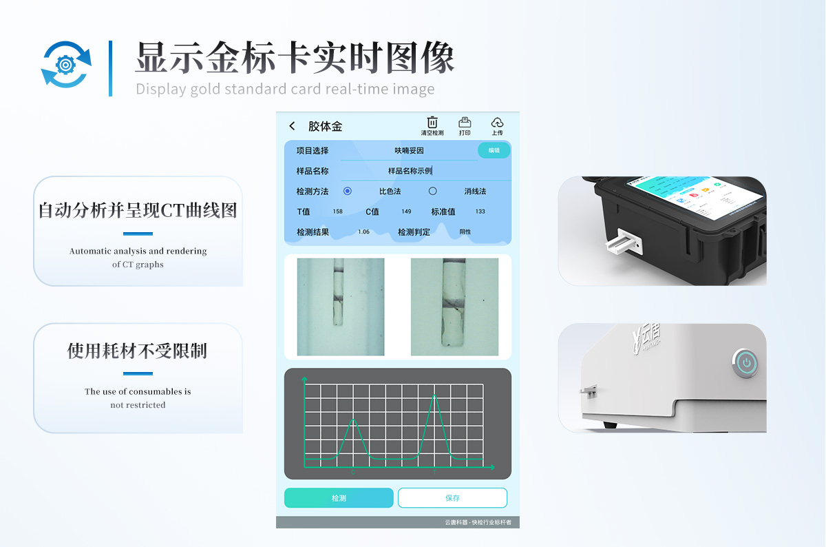 軌道式自動傳輸掃描方式,可實時顯示金標卡實時圖像,系統自動分析并呈現出CT曲線圖,CT線自動識別,無需手動調整,完成檢測后自動退出檢測卡。